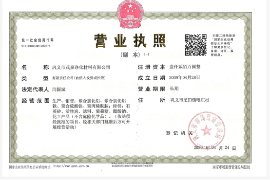 鞏義市茂泉凈化材料有限公司是集研制、開發、設計、生產、銷售服務于一體的凈水材料生產廠家,主要生產銷售聚合氯化鋁聚丙烯酰胺、聚合硫酸鐵、堿式氯化鋁等產品。公司技術力量雄厚,我公司秉承“提供優良產品,讓客戶滿意”的經營原則,為中小型企業提供產品和服務......